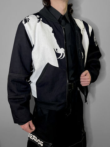 Jaqueta jeans 12oz com tingimento preto, modelagem bomber, zíper preto, pespontado nas costas e mangas, bolsos frontais canguru, cotoveleiras de couro legítimo, gola, barra e punho em ribana. Serigrafia frontal Nosferatu, serigrafia nas costas "Nightworker" com bordado cinza "logo 2024" acima e serigrafia na manga esquerda.